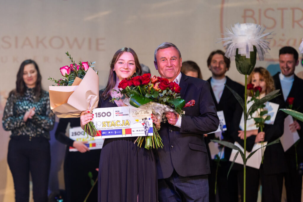 2023 r. Urszula Zubek odbiera nagrodę specjalną od Tadeusza Pałki, ale zdobyła też I miejsce za interpretacje piosenek „Zakochałam się w czwartek niechcący” i „Modlitwa o sen” (fot. Adam Pietrusiński)